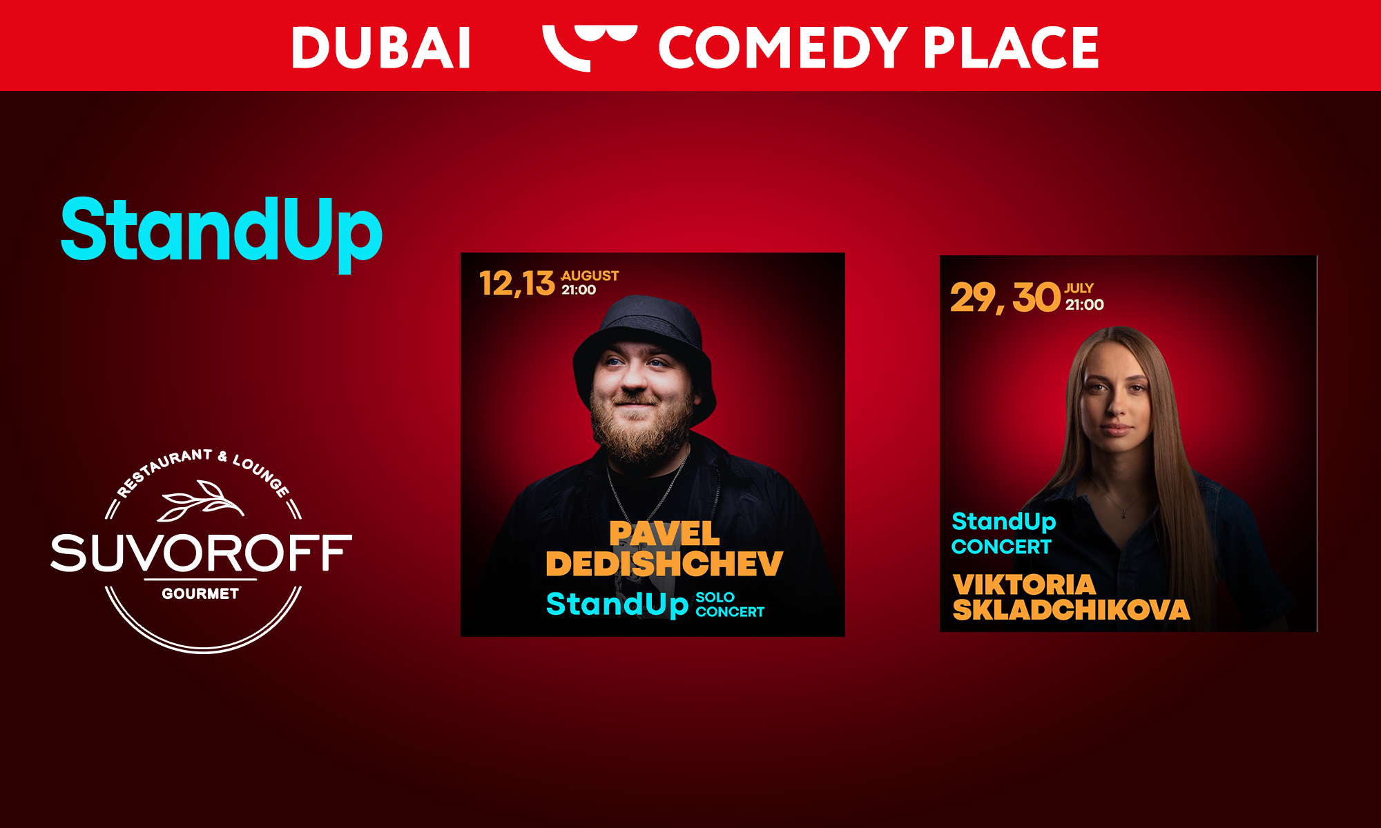 Comedy Place Dubai is a new stand up culture space, a real community of comedy lovers, and a house of humor, where you are always welcome! The best comedians will perform for you with their jokes, monologues and miniatures on the same stage. We invite you to spend your most cozy and funny evenings with us at the Suvoroff restaurant.